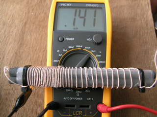 上記と同じ材料を使い、まず29回巻き、途中で反転させてさらに39回巻く。合計58回の密巻き。インダクタンスは174μH。