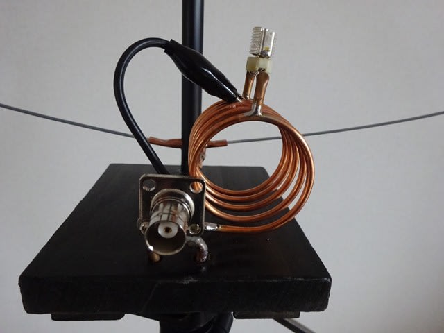 ループに電圧給電は初めてで、うまくマッチングしてくれるか不安でした。ノンラジアルアダプター(1/2λエレメント取付け)と同じ位置、コイル3巻き目にミノムシクリップを挟み、トリマーを回しましたが、SWRは下がらず、明確な共振点も見つかりません。クリップをコイル2巻き目に変更、トリマーで調整し、さらにコイル接点を探ったところ、145.000付近でSWR1.2まで下がってくれました。これ以外の組み合わせはどうかと試してみたものの、良い接点はみつからず、これで良しとしました。1/2λエレメントのようにベタ落ちとはなりません。逆に帯域は広いようです。今回のところはループにも電圧給電できること、整合が取れることが確かめられただけでとりあえず満足です。